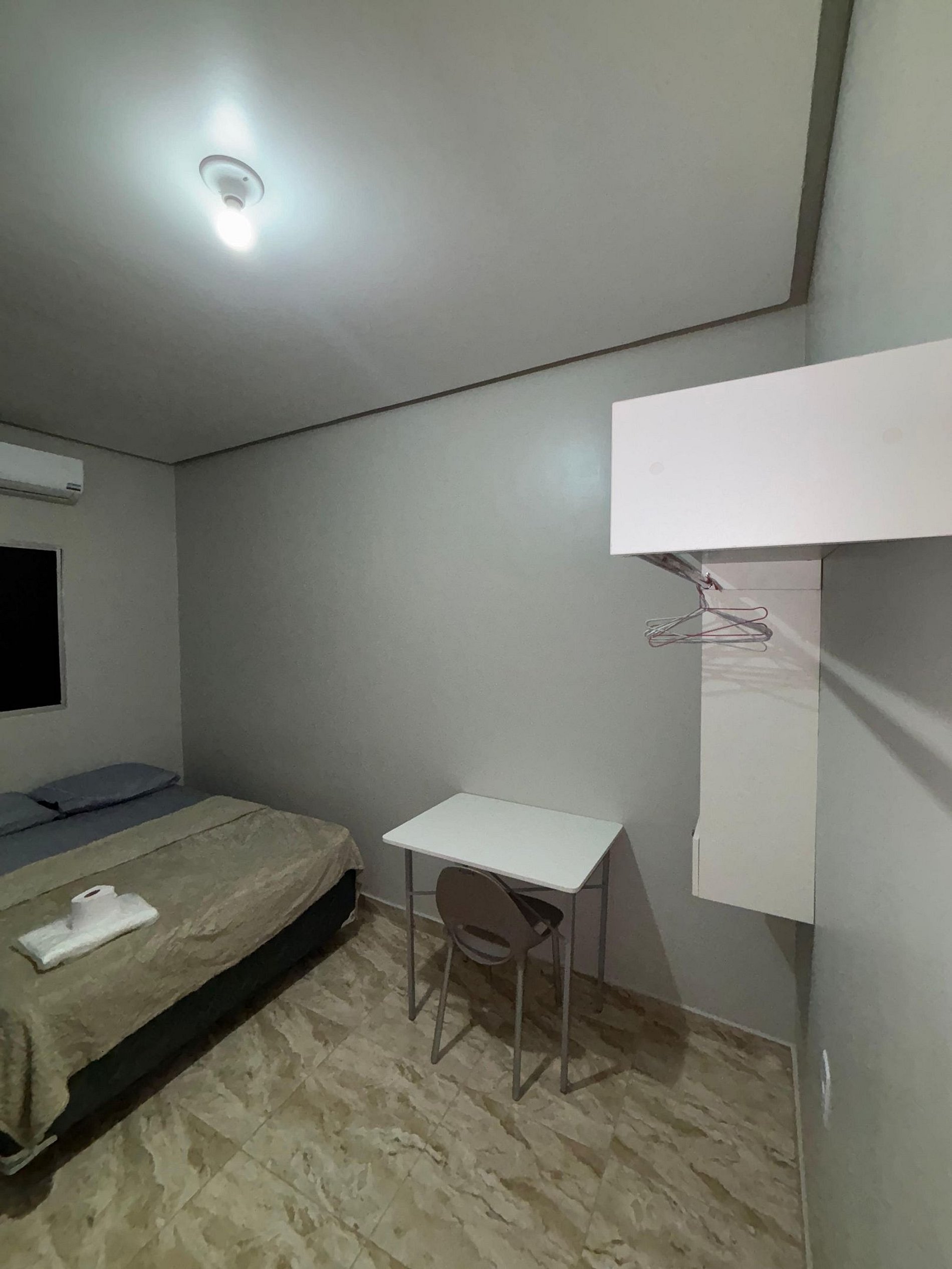 Suíte privativa, climatizada, com mesa de estudos, banheiro, smart TV, cama queen, gaveta e cabideiro.
